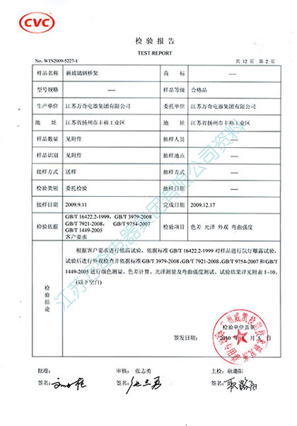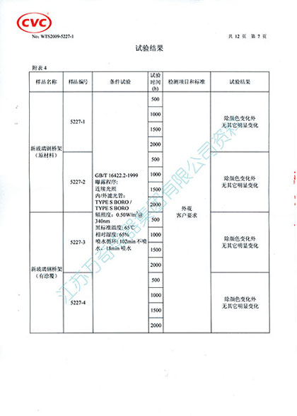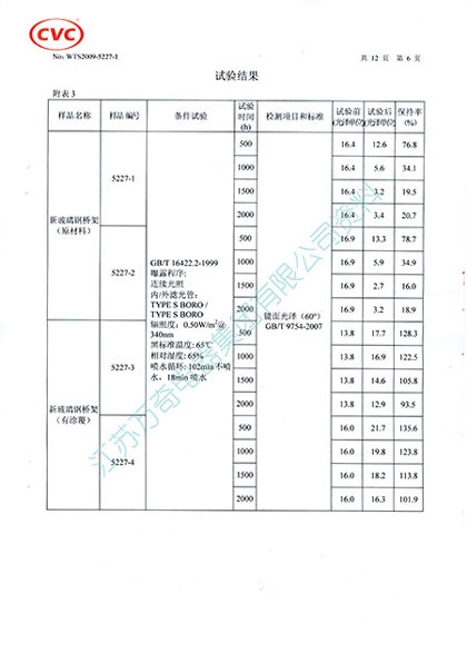 所有玻璃鋼及其復合產(chǎn)品都存在紫外線老化的問題,為解決這一難題,我公司通過創(chuàng)新,成功地將抗紫外線老化的VCI雙金屬復合涂層技術應用到鋼腹玻璃鋼橋架表面,覆涂VCI雙金屬復合涂層的鋼腹玻璃鋼橋架經(jīng)廣州威凱檢測技術研究所(原廣州電器科學研究院氣候試驗中心)2000小時光老化對比試驗檢測,檢測結果表明,未覆涂VCI涂層的試樣色差為27.36、光澤保持率為18.9%,覆涂VCI涂層的試樣色差為4.99、光澤保持率為93.5%;未覆涂VCI涂層的試樣試驗前彎曲強度為533MPa,試驗后為468.5MPa,抗彎強度降低12%,覆涂VCI涂層的試樣試驗前彎曲強度為496.1MPa,試驗后彎曲強度為470.8MPa,抗彎強度降低5%。以上試驗數(shù)據(jù)說明采用VCI雙金屬復合涂層的鋼腹玻璃鋼橋架是玻璃鋼制品表面抗老化課題的重大突破,該項技術的應用對于玻璃鋼制品在抗老化、延長使用壽命方面具有十分重要的意義,顯著降低了用戶的投資攤銷費用。